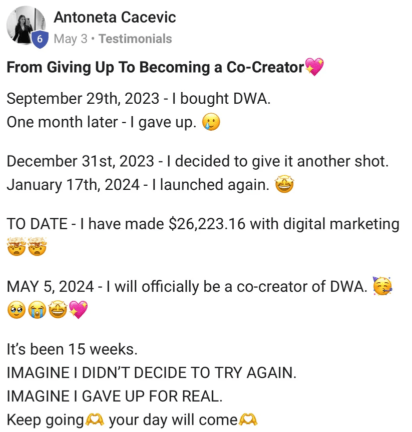 Learn how to promote The DWA course or any other product. This will teach you how to quickly grow your audience and make sales via social media marketing.